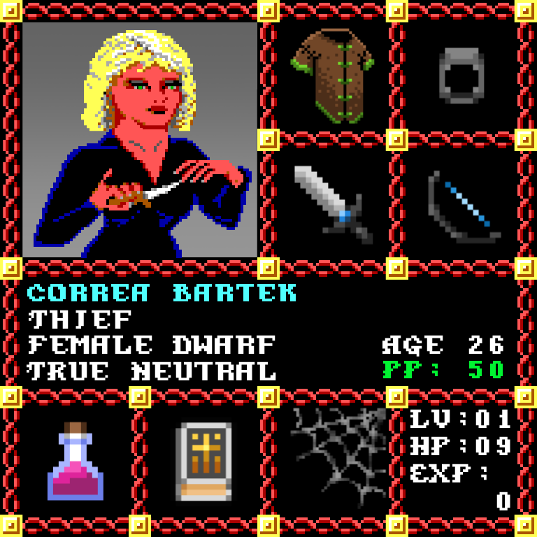 Correa Bartek is a Female Dwarf, born to be a Thief. Since her birth, for the last 26 years, her alignment has been True Neutral and she has been honing her skills with the Broadsword +2. She also carries the following: [Potion of Strength] [Phlan Journal Entries 29-40] > > > Correa Bartek is part of the Genesis Series of the Players Guild NFT Pool of Radiance Tribute.