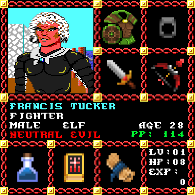 Francis Tucker is a Male Elf, born to be a Fighter. Since his birth, for the last 28 years, his alignment has been Neutral Evil and he has been honing his skills with the Broadsword +4. He also carries the following: [Potion of Extra Healing ] [Phlan Journal Entries 41-50] [Scroll of Protection from Evil x80] > > > Francis Tucker is part of the Genesis Series of the Players Guild NFT Pool of Radiance Tribute.