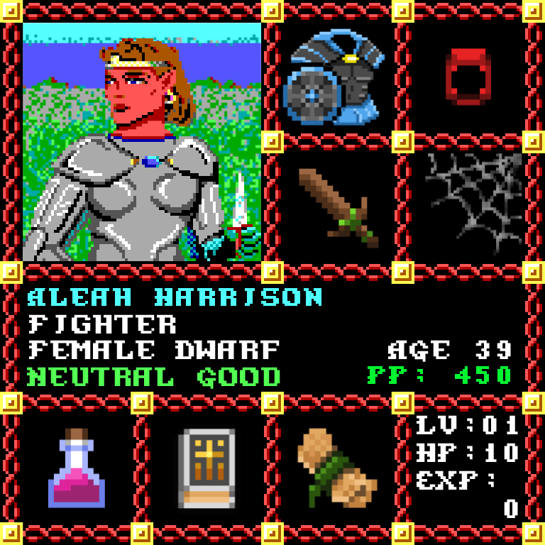 Aleah Harrison is a Female Dwarf, born to be a Fighter. Since her birth, for the last 39 years, her alignment has been Neutral Good and she has been honing her skills with the Broadsword. She also carries the following: [Potion of Strength] [Phlan Journal Entries 29-40] [Scroll of Sleep x50] > > > Aleah Harrison is part of the Genesis Series of the Players Guild NFT Pool of Radiance Tribute.