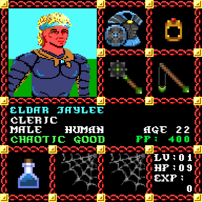 Eldar Jaylee is a Male Human, born to be a Cleric. Since his birth, for the last 22 years, his alignment has been Chaotic Good and he has been honing his skills with the Mace. He also carries the following: [Potion of Extra Healing ] > > > Eldar Jaylee is part of the Genesis Series of the Players Guild NFT Pool of Radiance Tribute.