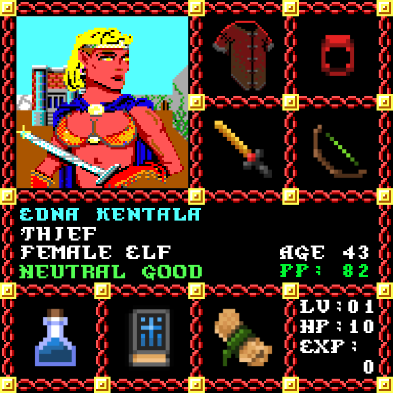Edna Kentala is a Female Elf, born to be a Thief. Since her birth, for the last 43 years, her alignment has been Neutral Good and she has been honing her skills with the Short Sword +3. She also carries the following: [Potion of Extra Healing ] [Phlan Journal Entries 16-28] [Scroll of Sleep x50] > > > Edna Kentala is part of the Genesis Series of the Players Guild NFT Pool of Radiance Tribute.
