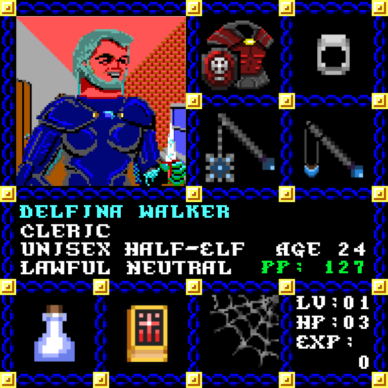 Delfina Walker is a Unisex Half-Elf, born to be a Cleric. Since their birth 24 years ago, their alignment has been Lawful Neutral and they have been honing their skills with the Flail +1. They also carry the following: [Potion of Speed] [Phlan Journal Entries 41-50] > > > Delfina Walker is part of the Genesis Series of the Players Guild NFT Pool of Radiance Tribute.
