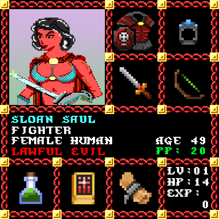 Sloan Saul is a Female Human, born to be a Fighter. Since her birth, for the last 49 years, her alignment has been Lawful Evil and she has been honing her skills with the Short Sword +2. She also carries the following: [Potion of Healing ] [Phlan Journal Entries 41-50] [Scroll of Hold Person x70] > > > Sloan Saul is part of the Genesis Series of the Players Guild NFT Pool of Radiance Tribute.